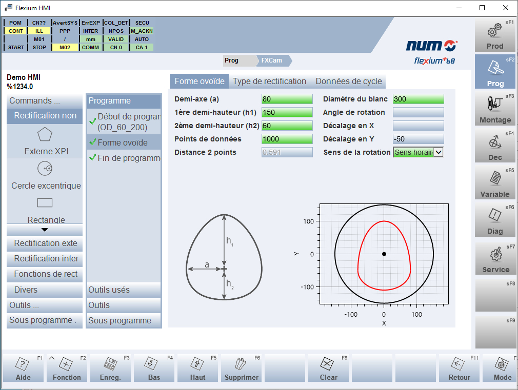 La forme fermée de la pièce est définie dans le plan XY. Cependant, la rectification est effectuée par interpolation ou synchronisation de l'axe X avec l'axe C (broche de la pièce). Le mouvement axial dans l'axe Z peut également être pris en compte, par oscillation ou "multi-plongée". La CNC Flexium+ transforme le contour du plan XY en plan XC, et calcule les mouvements de compensation et d'avance correspondants, en tenant compte du diamètre de la meule. Le profil de vitesse est également transformé, de sorte que la vitesse et l'accélération soient automatiquement adaptées aux caractéristiques physiques de la machine.